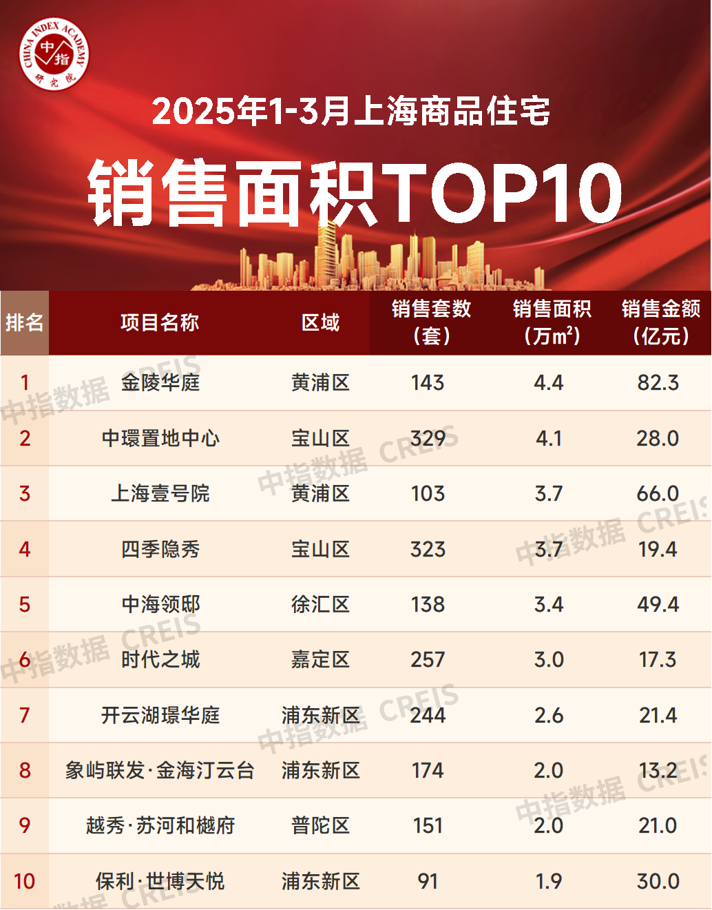 2025年1-3月,上海商品住所出卖面积TOP10项目合计出卖面积为30.7万平。个中,金陵华庭以4.4万平攻陷项目出卖面积榜单的第一名,中环置地核心以4.1万平紧随其后,上海壹号院3.7万平位列第三名。