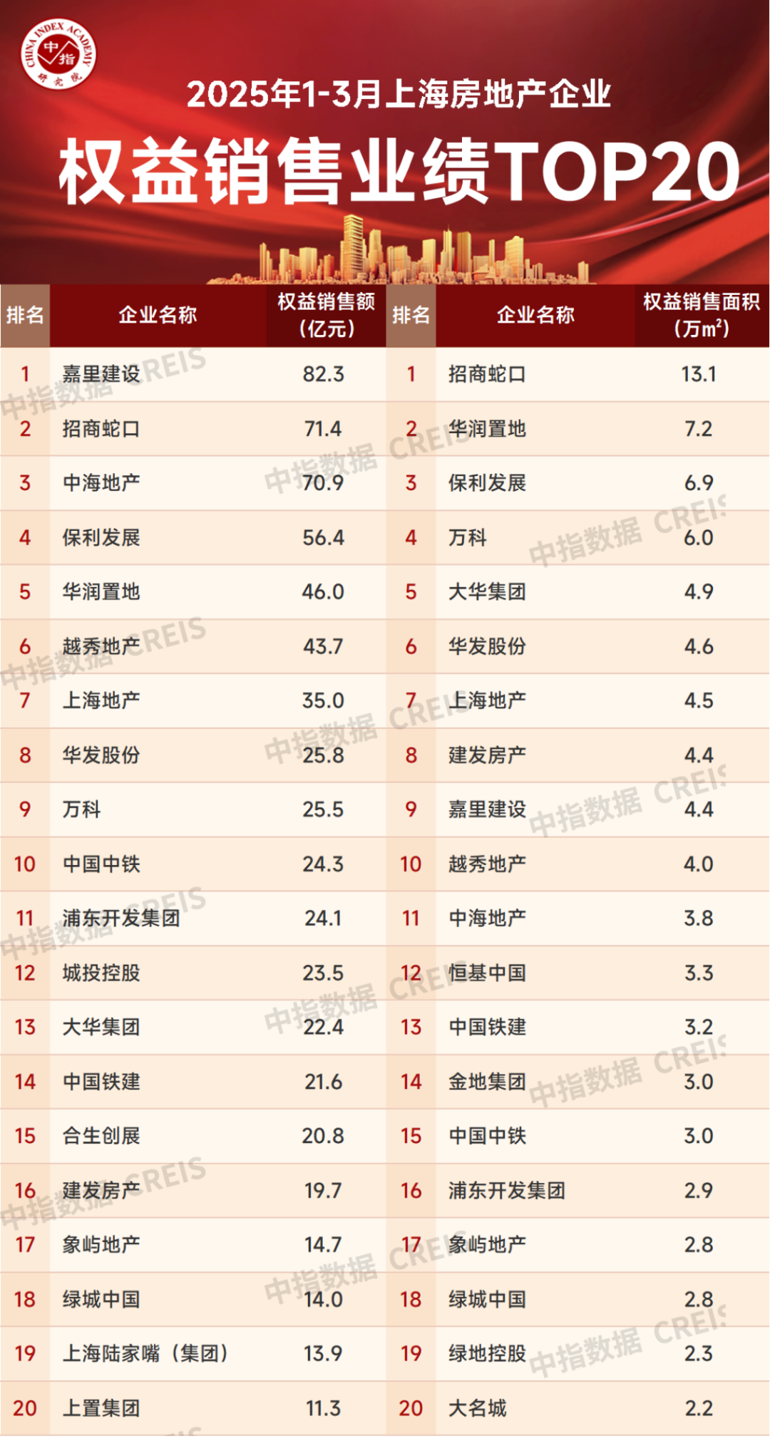 2025年1-3月,上海房地产权力出卖事迹TOP20企业合计出卖667.3亿元;权力出卖面积TOP20企业合计出卖89.4万平。权力出卖额冲破50亿元的房企有4家,个中嘉里成立、招商蛇口、中海地产区别以82.3亿元、71.4亿元和70.9亿元取得出卖金额榜前三名;权力出卖面积榜中,招商蛇口、华润置地、保利生长区别以13.1万平、7.2万幽静6.9万平取得前三名。