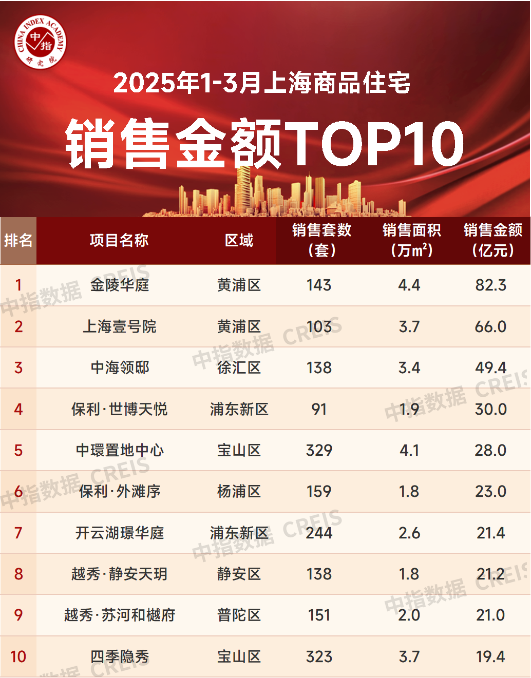 2025年1-3月,上海商品住所出卖金额TOP10项目合计出卖361.6亿元。本次TOP10门槛值为19.4亿元。个中,第一名金陵华庭出卖金额为82.3亿元,第二名上海壹号院66.0亿元、第三名中海领邸49.4亿元。