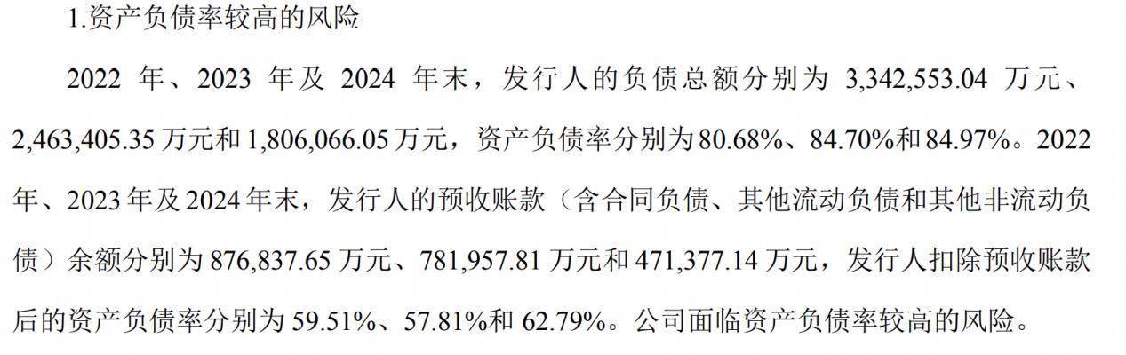 2022年、2023年及2024年终,特房集团的欠债总额差异为334.26亿元、246.34亿元和180.61亿元,资产欠债率差异为80.68%、84.70%和84.97%。2022年、2023年及2024年终,特房集团的预收账款(含合同欠债、其他活动欠债和其他非活动欠债)余额差异为87.68亿元、78.2亿元和47.14亿元,特房集团扣除预收账款后的资产欠债率差异为59.51%、57.81%和62.79%。公司面对资产欠债率较高的危害。