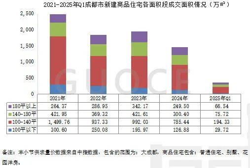 近年来,刷新型住屋产物渐渐成为成都邑新修商品住屋的成交主体。2021-2024年,100平方米以内的刚需住屋产物的成交量占比由12%降至9%;跟着栖身需求升级和供应端调理,100-140平方米的刚改和140-180平方米的二改产物成为主流;180平方米以上的住屋需求量也正在渐渐增长。2025年一季度,100-140平方米的产物成交量最众,约占总成交量的53%。