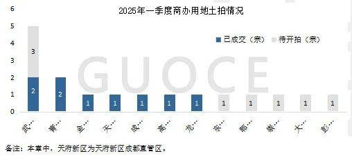 2025年一季度共推出17宗商办用地,此中8宗地已成交,其余9宗待开拍。从各区来看,武侯区已成交量和待开拍宗地数最众。