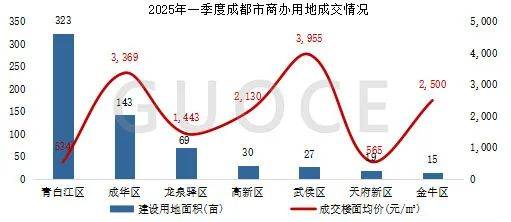2025年一季度成都邑商办用地成交量为627.19亩。从各区来看,青白江区成交量最高,达323亩,成交楼面均价为534元/㎡。武侯区商办用地成交楼面均价最高,达3,955元/㎡。