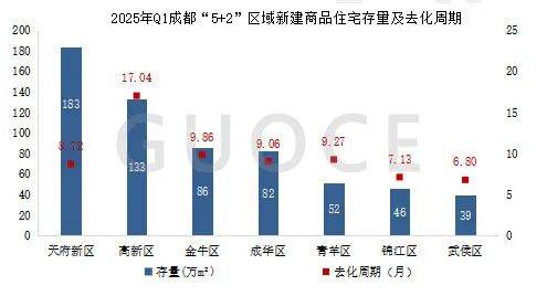 截止到2025年一季度,成都邑“5+2”区域新修商品住屋存量为623万平方米,此中天府新区存量最众,为183万平方米,占比29%;武侯区存量起码,为39万平方米。高新区的去化周期最长,为17.04个月;武侯区去化周期为短为6.8个月。